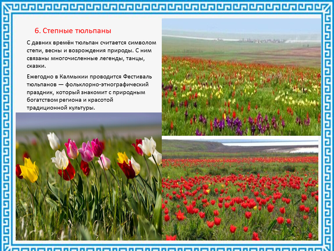 Ежегодно в Калмыкии проводится Фестиваль тюльпанов — фольклорно-этнографический праздник, который знакомит с природным богатством региона и красотой традиционной культуры.