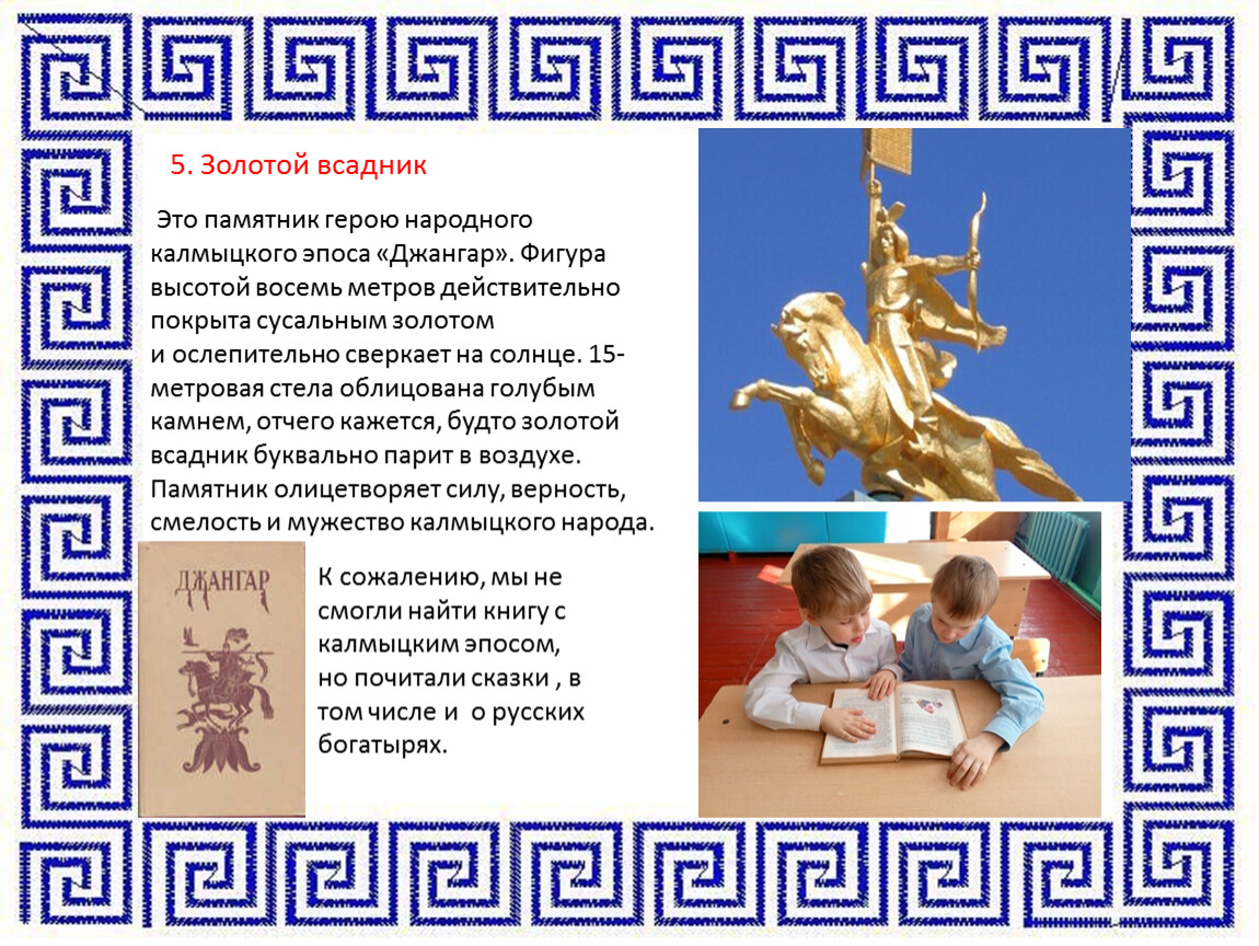 К сожалению, мы не смогли найти книгу с калмыцким эпосом, но почитали сказки , в том числе и о русских богатырях.