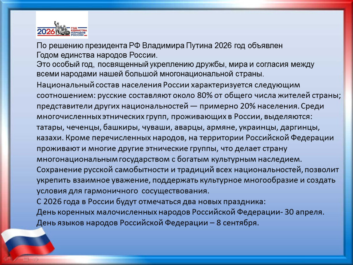 Это особый год, посвященный укреплению дружбы, мира и согласия между всеми народами нашей большой многонациональной страны.