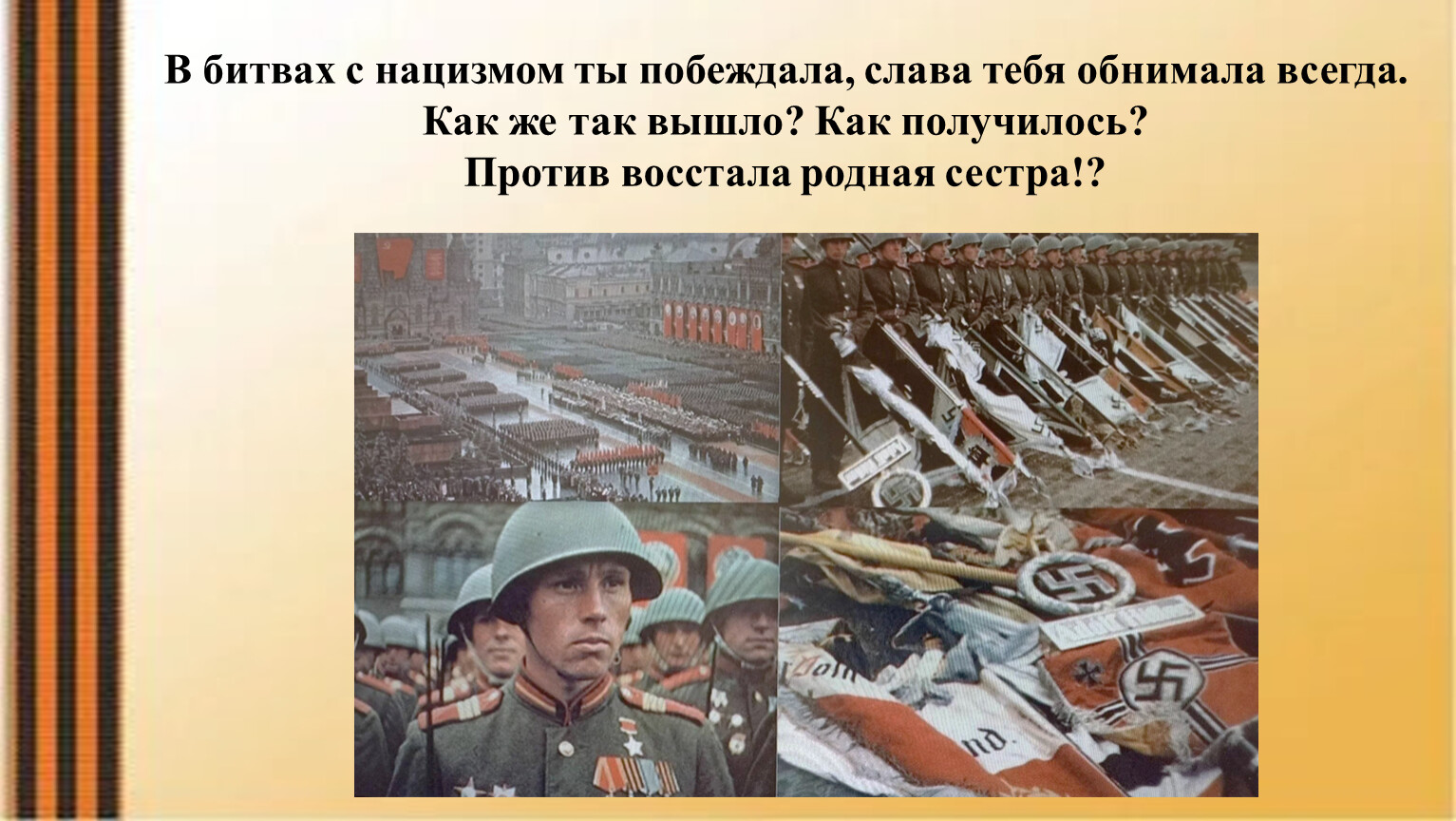 В битвах с нацизмом ты побеждала, слава тебя обнимала всегда.