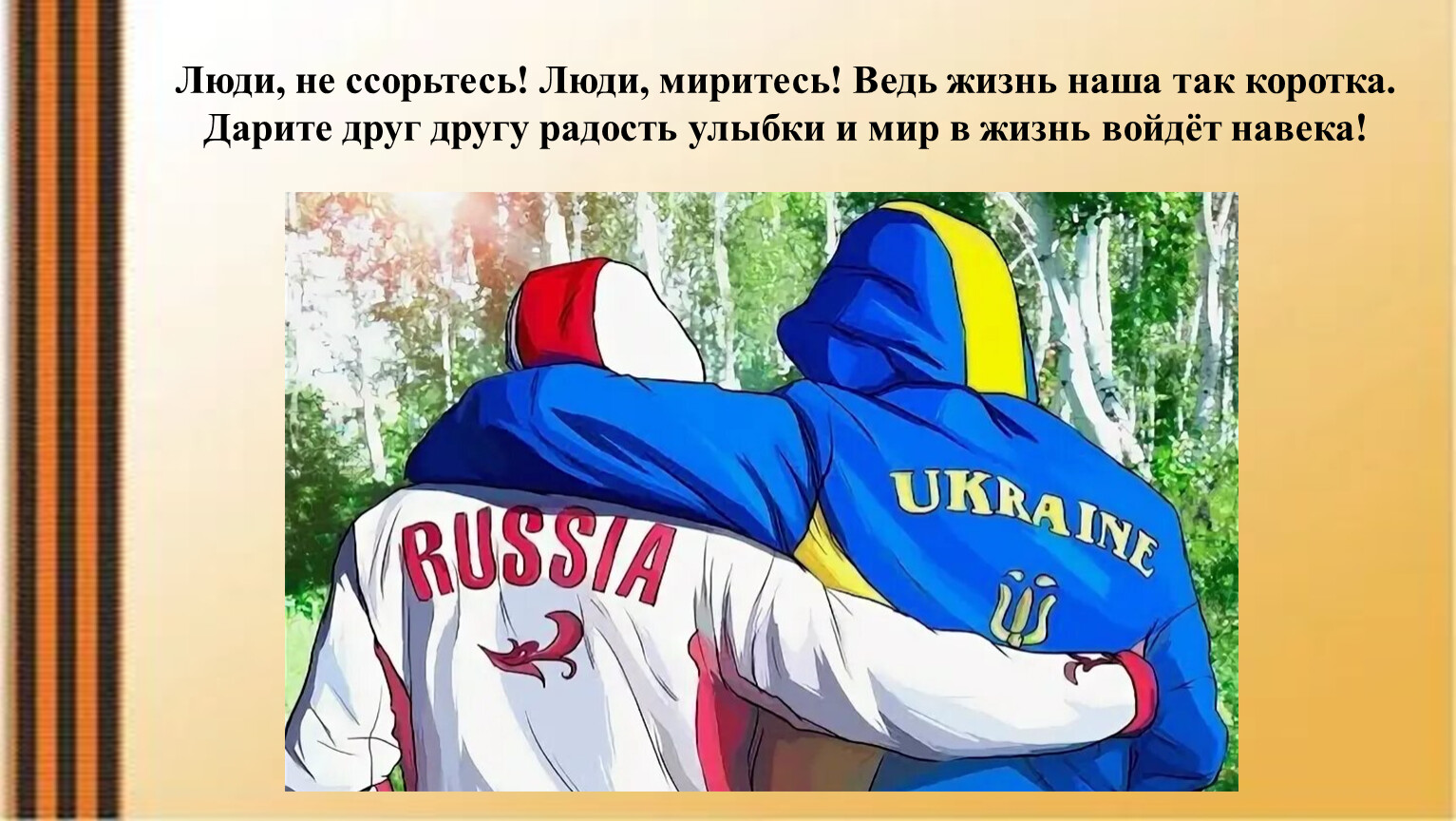 Люди, не ссорьтесь! Люди, миритесь! Ведь жизнь наша так коротка.