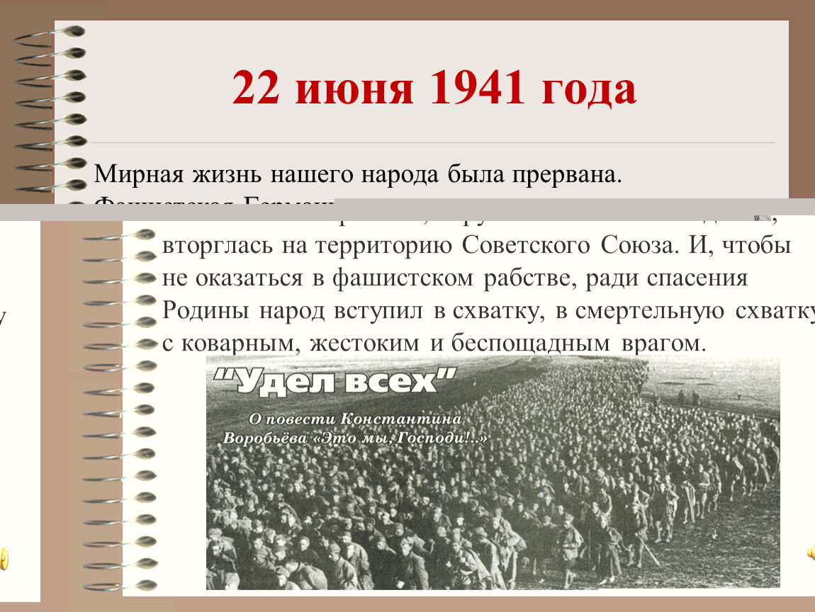 Мирная жизнь нашего народа была прервана. Фашистская Германия, нарушив пакт о ненападении, вторглась на территорию Советского Союза. И, чтобы не оказаться в фашистском рабстве, ради спасения Родины народ вступил в схватку, в смертельную схватку с коварным, жестоким и беспощадным врагом.