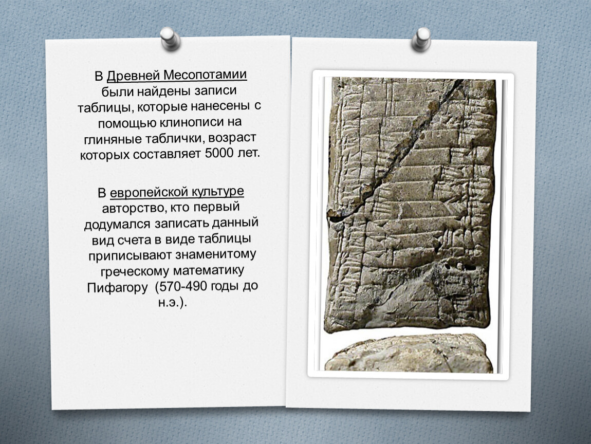 В Древней Месопотамии были найдены записи таблицы, которые нанесены с помощью клинописи на глиняные таблички, возраст которых составляет 5000 лет.