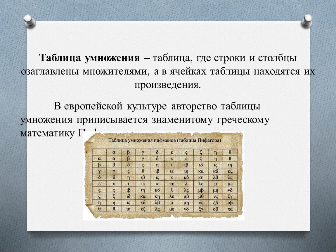 В европейской культуре авторство таблицы умножения приписывается знаменитому греческому математику Пифагору.