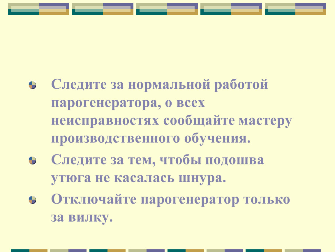Следите за нормальной работой парогенератора, о всех неисправностях сообщайте мастеру производственного обучения.