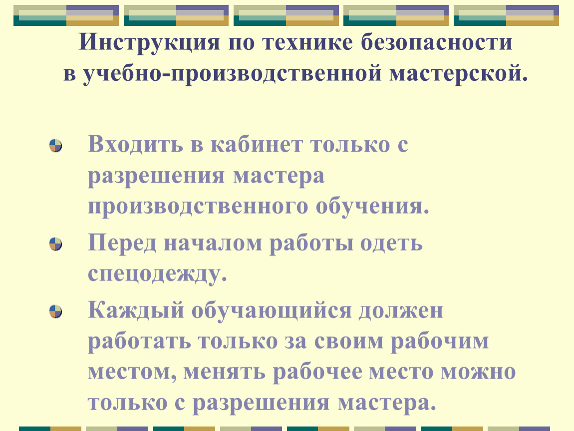 Входить в кабинет только с разрешения мастера производственного обучения.