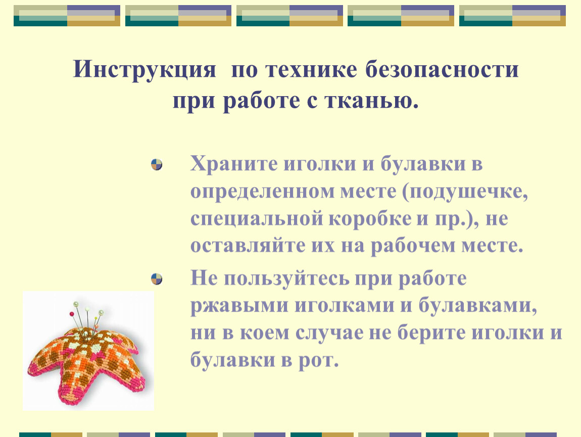 Не пользуйтесь при работе ржавыми иголками и булавками, ни в коем случае не берите иголки и булавки в рот.