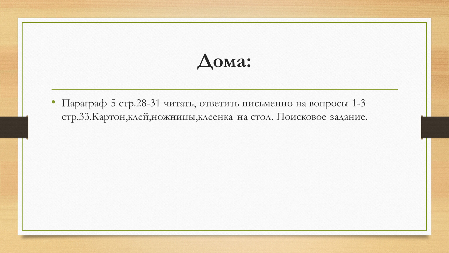 Параграф 5 стр.28-31 читать, ответить письменно на вопросы 1-3 стр.33.Картон,клей,ножницы,клеенка на стол. Поисковое задание.