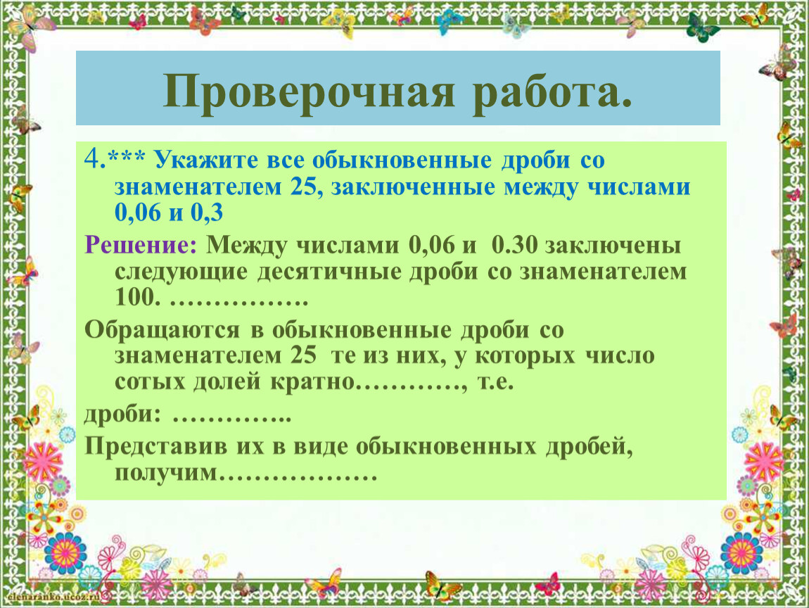 4.*** Укажите все обыкновенные дроби со знаменателем 25, заключенные между числами 0,06 и 0,3