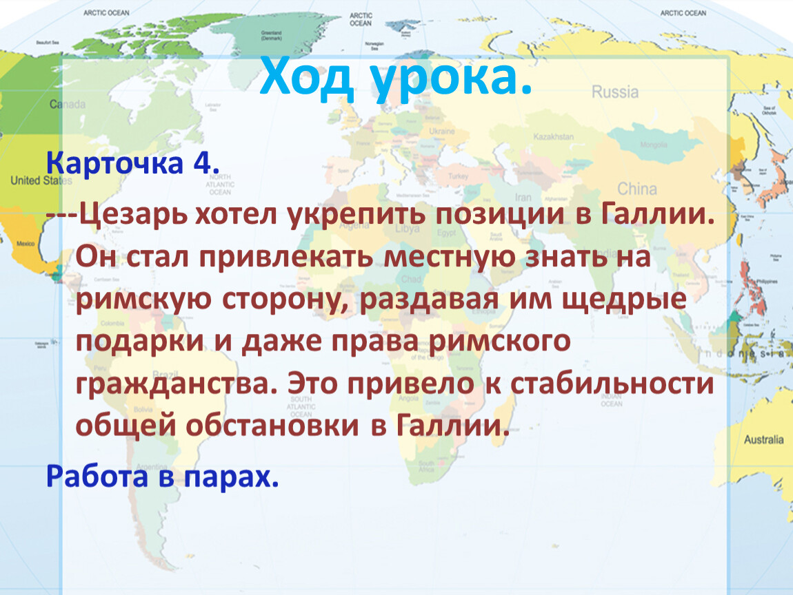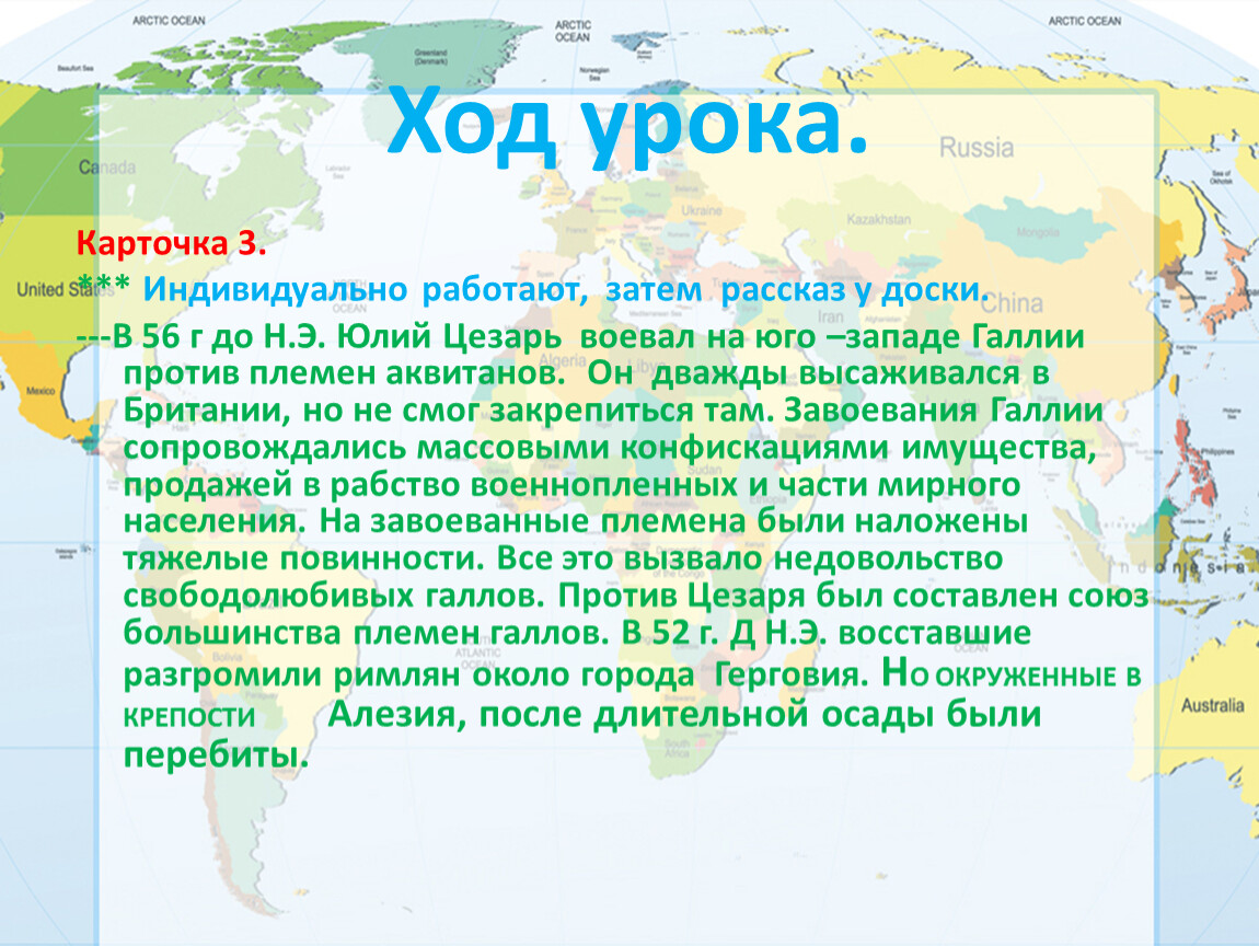 ---В 56 г до Н.Э. Юлий Цезарь воевал на юго –западе Галлии против племен аквитанов. Он дважды высаживался в Британии, но не смог закрепиться там. Завоевания Галлии сопровождались массовыми конфискациями имущества, продажей в рабство военнопленных и части мирного населения. На завоеванные племена были наложены тяжелые повинности. Все это вызвало недовольство свободолюбивых галлов. Против Цезаря был составлен союз большинства племен галлов. В 52 г. Д Н.Э. восставшие разгромили римлян около города Герговия. НО ОКРУЖЕННЫЕ В КРЕПОСТИ Алезия, после длительной осады были перебиты.