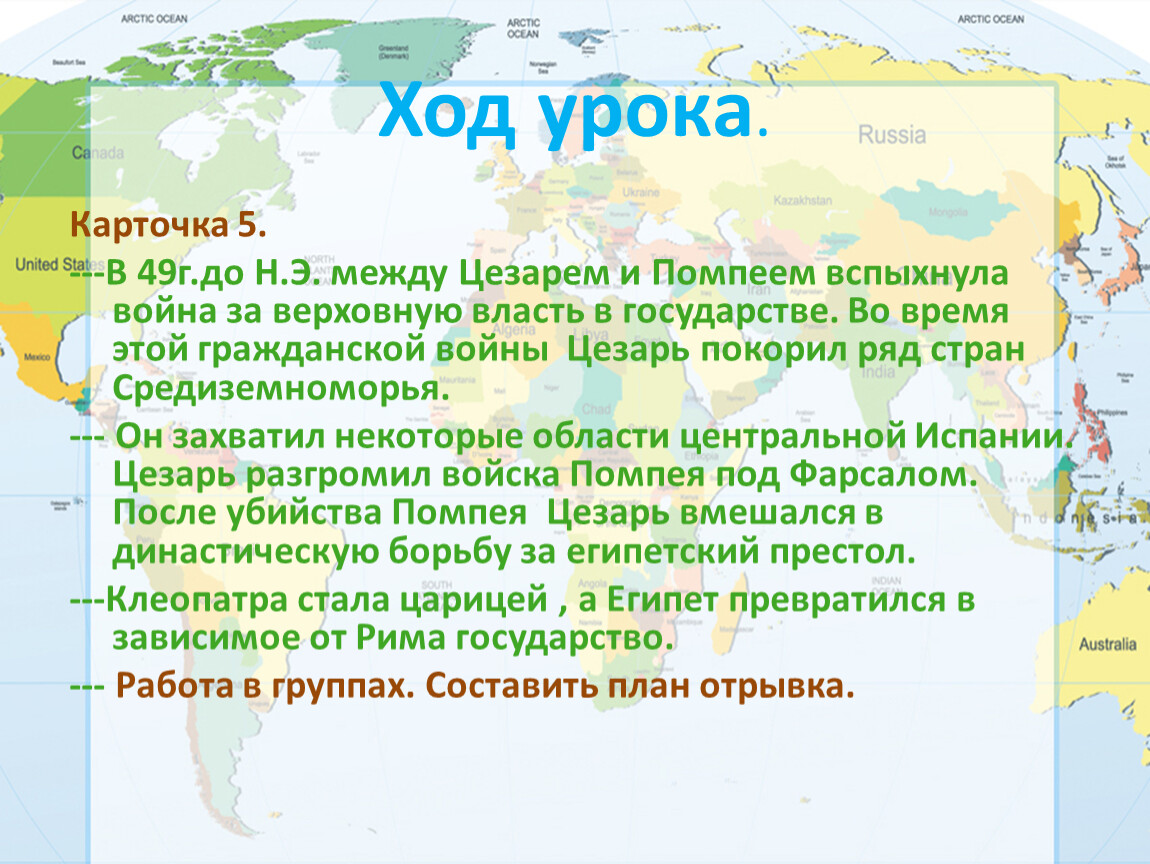 --- Он захватил некоторые области центральной Испании. Цезарь разгромил войска Помпея под Фарсалом. После убийства Помпея Цезарь вмешался в династическую борьбу за египетский престол.