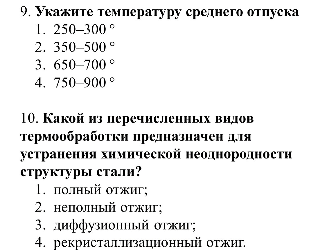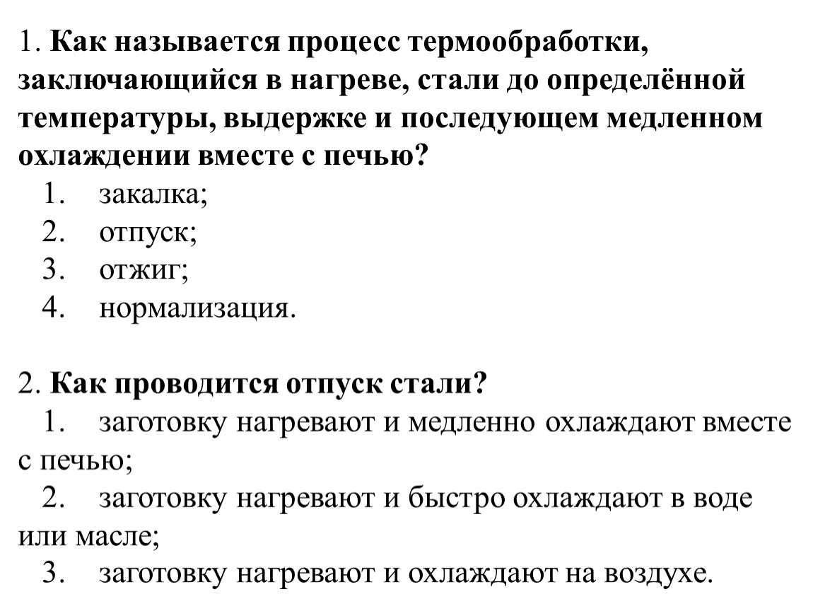 1. Как называется процесс термообработки, заключающийся в нагреве, стали до определённой температуры, выдержке и последующем медленном охлаждении вместе с печью? 1. закалка; 2. отпуск; 3. отжиг; 4. нормализация.2. Как проводится отпуск стали? 1. заготовку нагревают и медленно охлаждают вместе с печью; 2. заготовку нагревают и быстро охлаждают в воде или масле; 3. заготовку нагревают и охлаждают на воздухе.