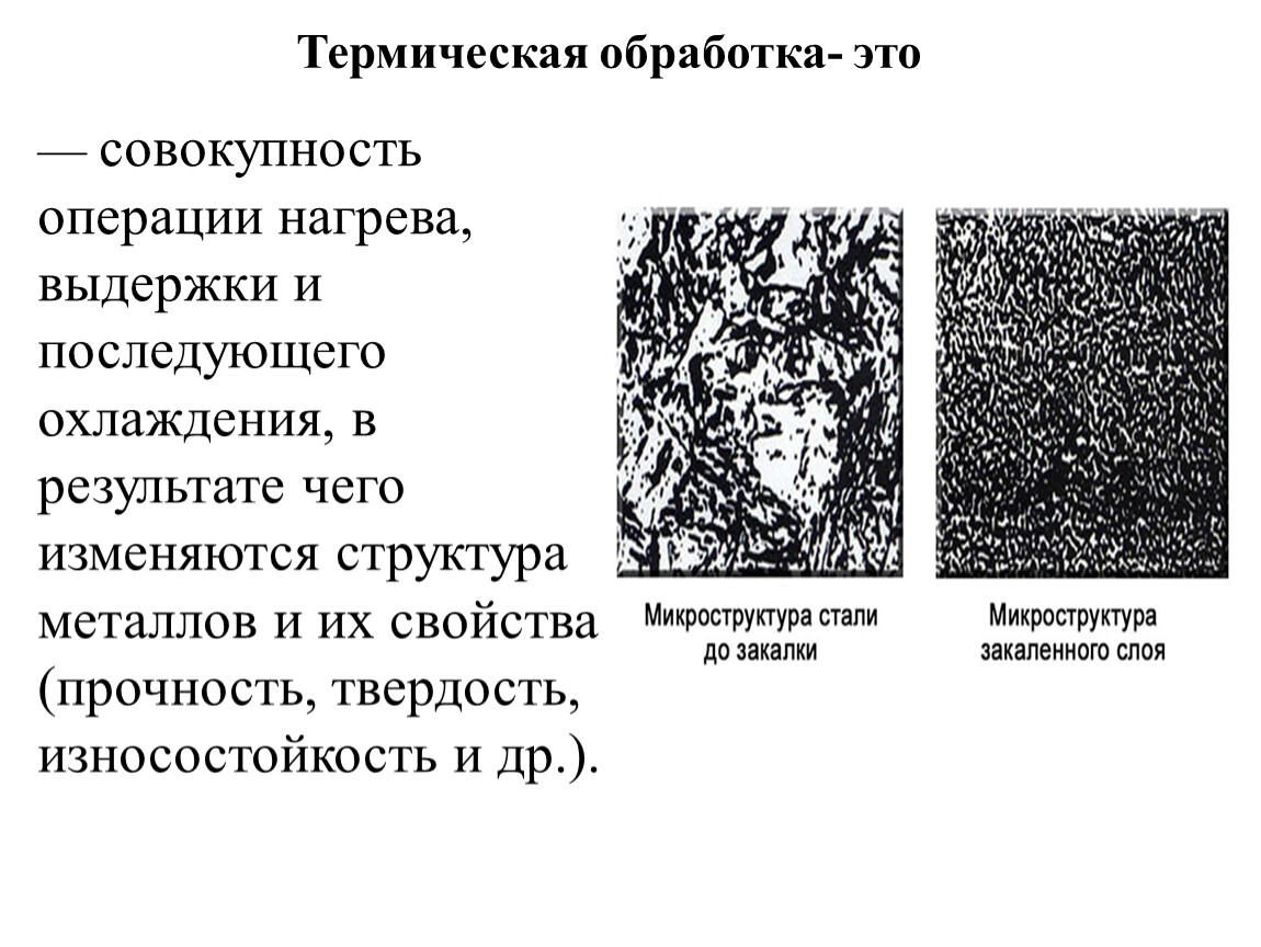 — совокупность операции нагрева, выдержки и последующего охлаждения, в результате чего изменяются структура металлов и их свойства (прочность, твердость, износостойкость и др.).