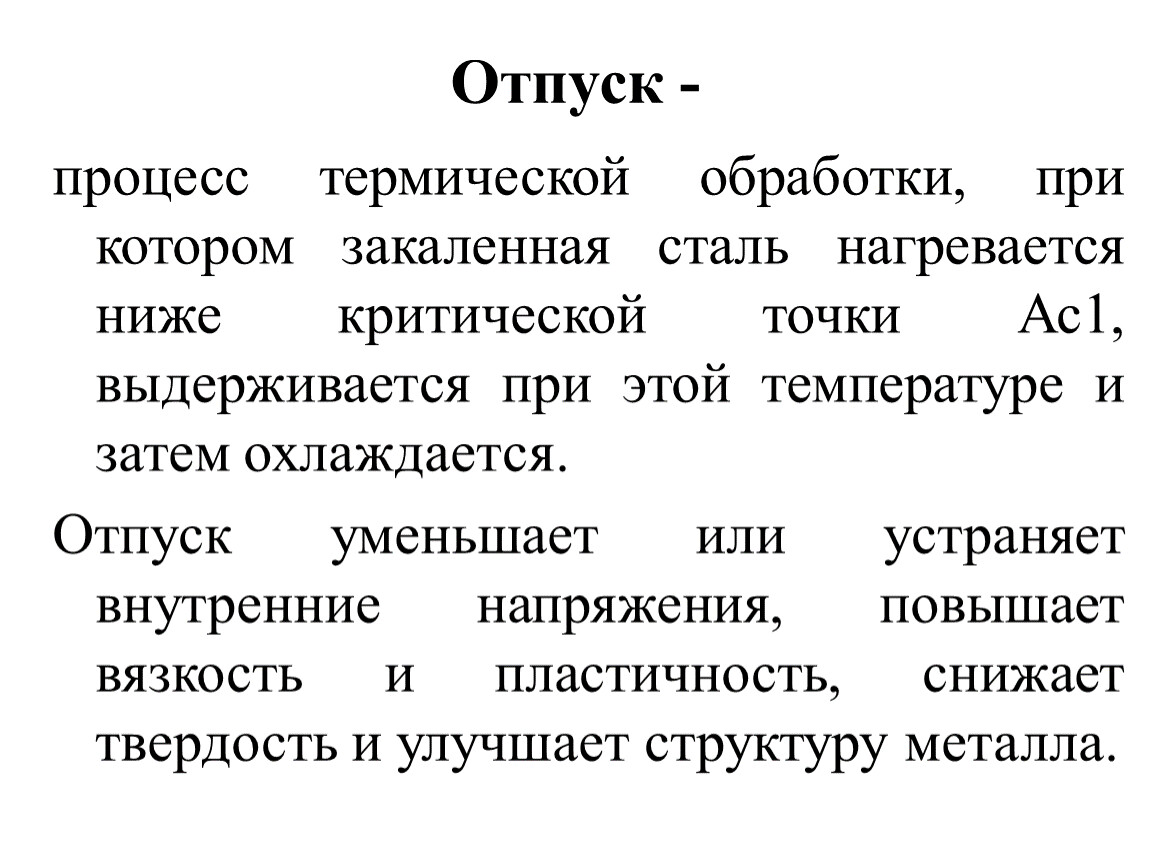 Отпуск уменьшает или устраняет внутренние напряжения, повышает вязкость и пластичность, снижает твердость и улучшает структуру металла.