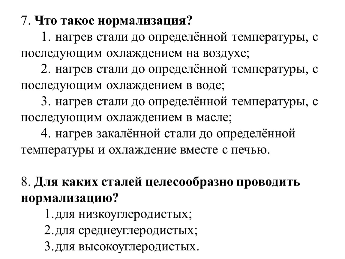 7. Что такое нормализация? 1. нагрев стали до определённой температуры, с последующим охлаждением на воздухе; 2. нагрев стали до определённой температуры, с последующим охлаждением в воде; 3. нагрев стали до определённой температуры, с последующим охлаждением в масле; 4. нагрев закалённой стали до определённой температуры и охлаждение вместе с печью.8. Для каких сталей целесообразно проводить нормализацию? 1. для низкоуглеродистых; 2. для среднеуглеродистых; 3. для высокоуглеродистых.