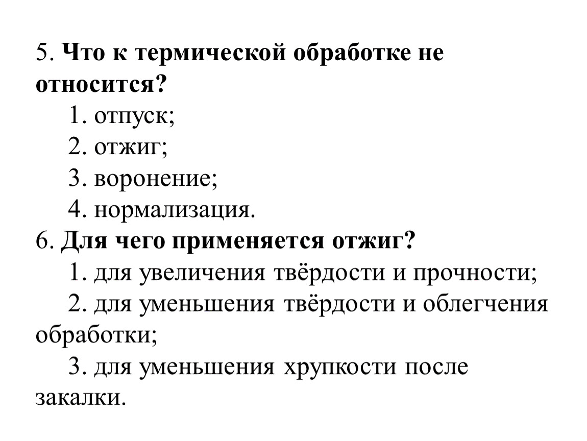 5. Что к термической обработке не относится? 1. отпуск; 2. отжиг; 3. воронение; 4. нормализация.6. Для чего применяется отжиг? 1. для увеличения твёрдости и прочности; 2. для уменьшения твёрдости и облегчения обработки; 3. для уменьшения хрупкости после закалки.