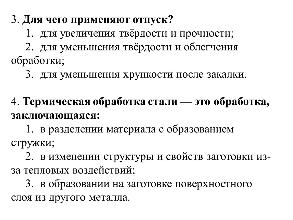3. Для чего применяют отпуск? 1. для увеличения твёрдости и прочности; 2. для уменьшения твёрдости и облегчения обработки; 3. для уменьшения хрупкости после закалки.4. Термическая обработка стали — это обработка, заключающаяся: 1. в разделении материала с образованием стружки; 2. в изменении структуры и свойств заготовки из-за тепловых воздействий; 3. в образовании на заготовке поверхностного слоя из другого металла.