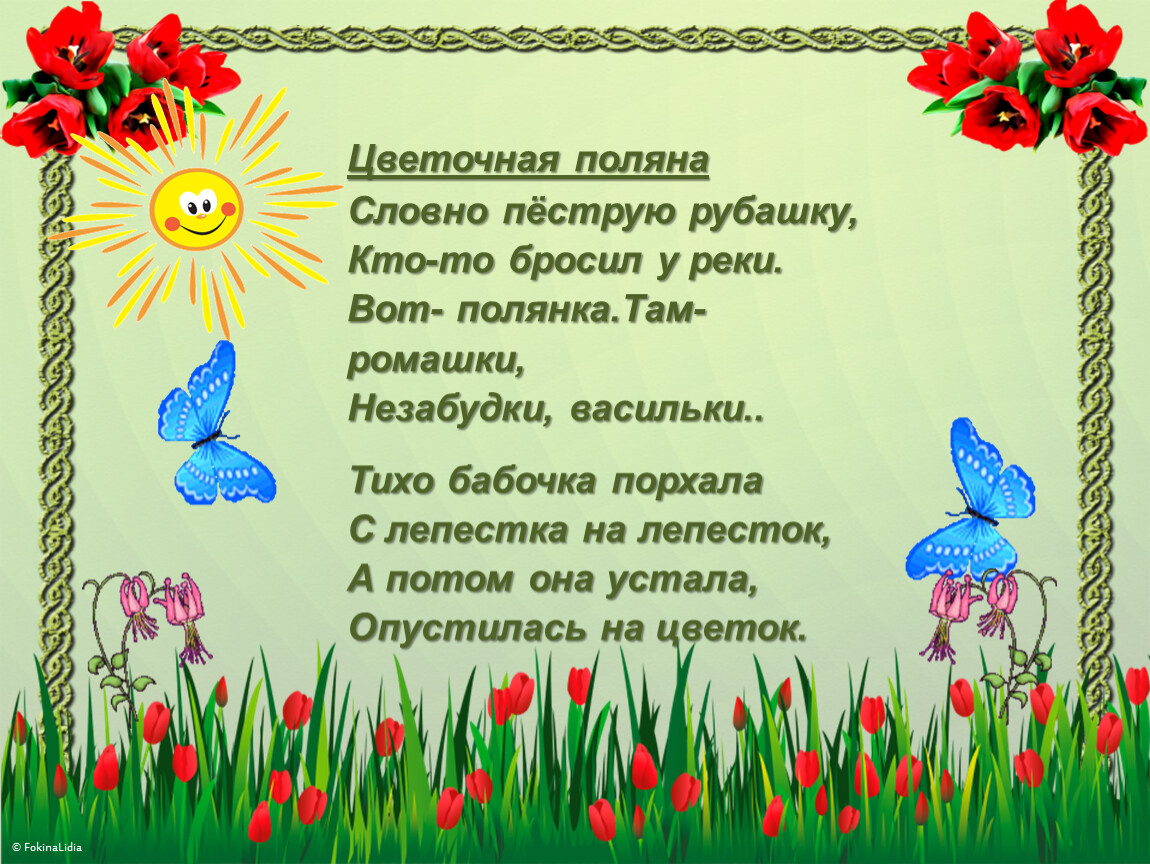 Словно пёструю рубашку,Кто-то бросил у реки.Вот- полянка.Там- ромашки, Незабудки, васильки..