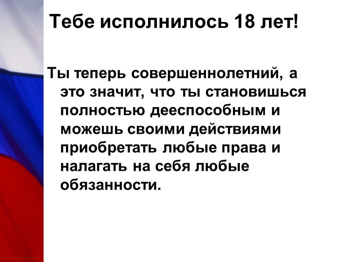 Ты теперь совершеннолетний, а это значит, что ты становишься полностью дееспособным и можешь своими действиями приобретать любые права и налагать на себя любые обязанности.