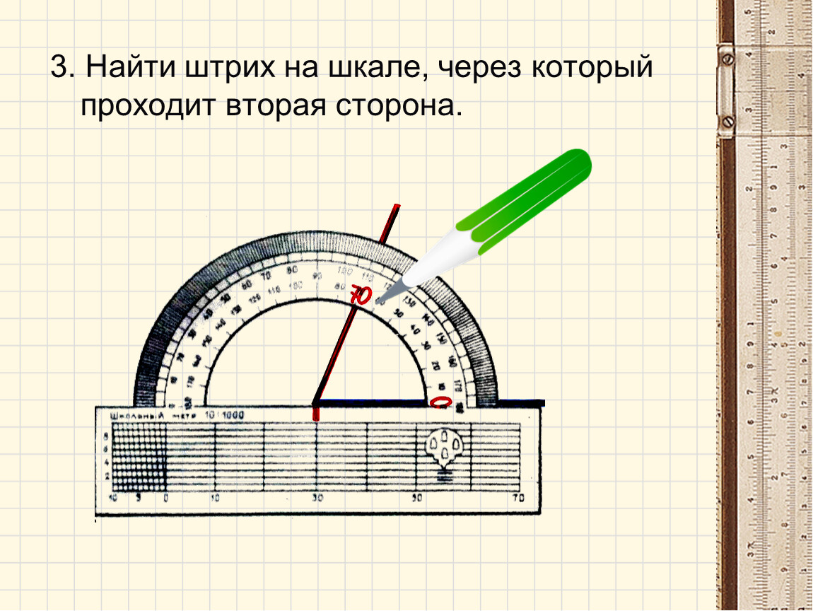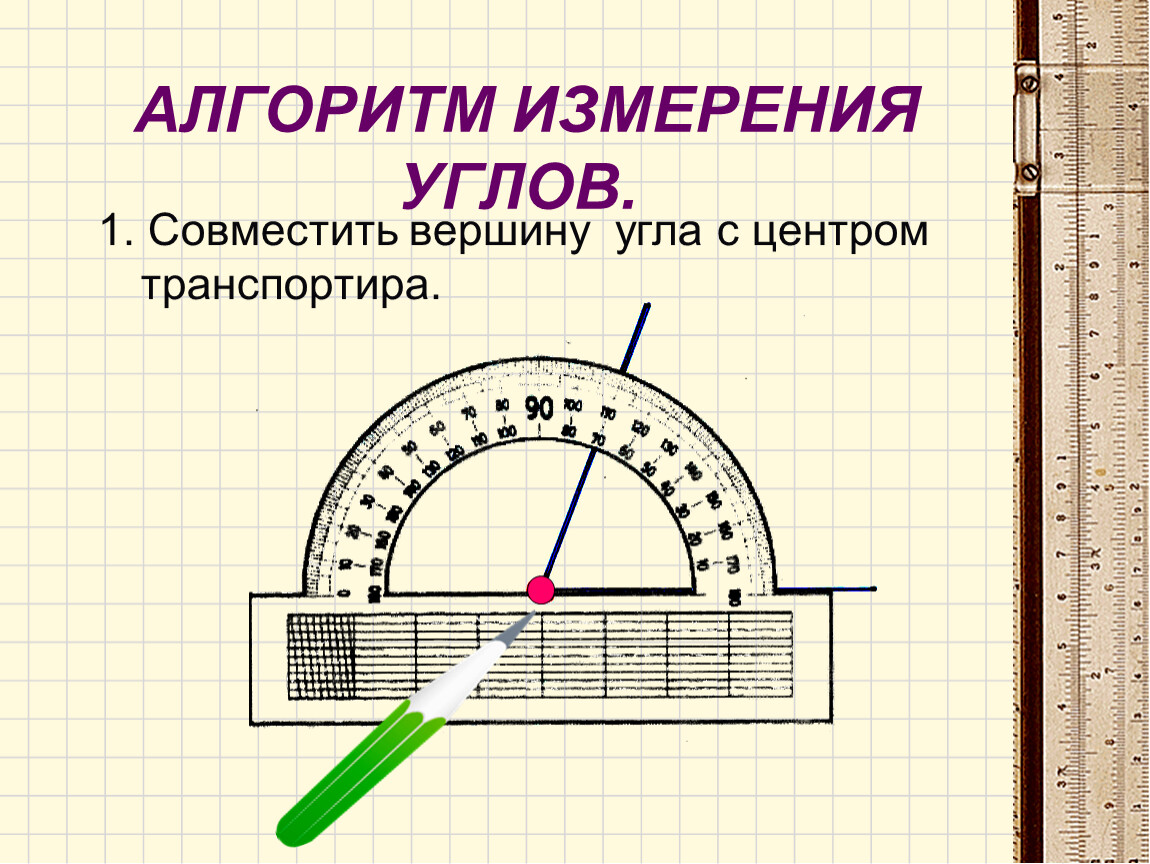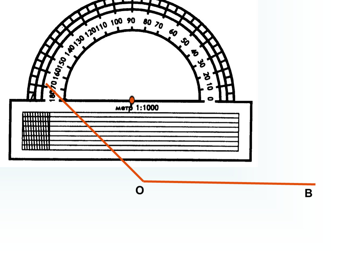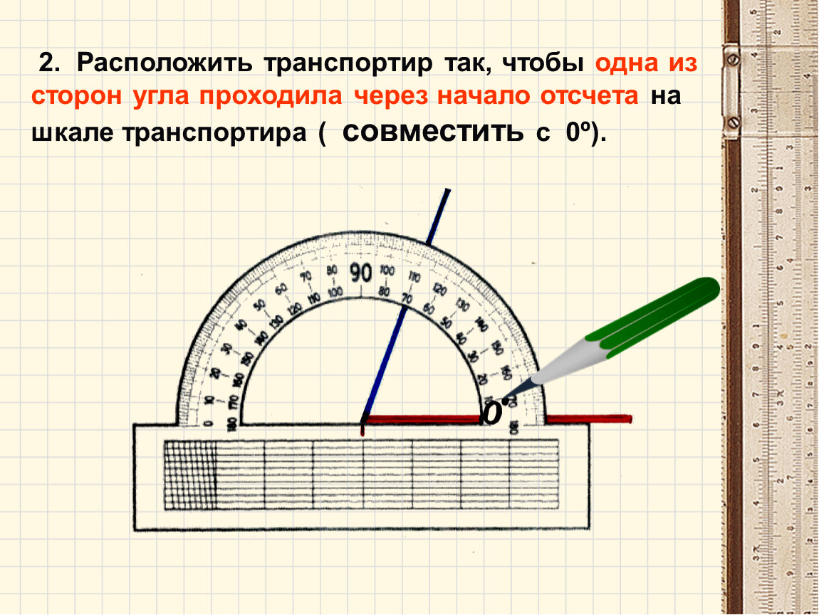 2. Расположить транспортир так, чтобы одна из сторон угла проходила через начало отсчета на шкале транспортира ( совместить с 0º).