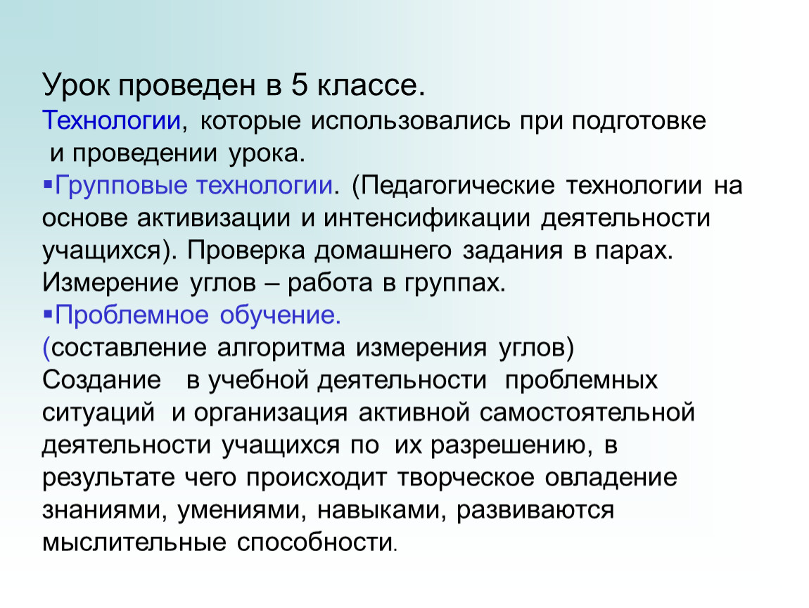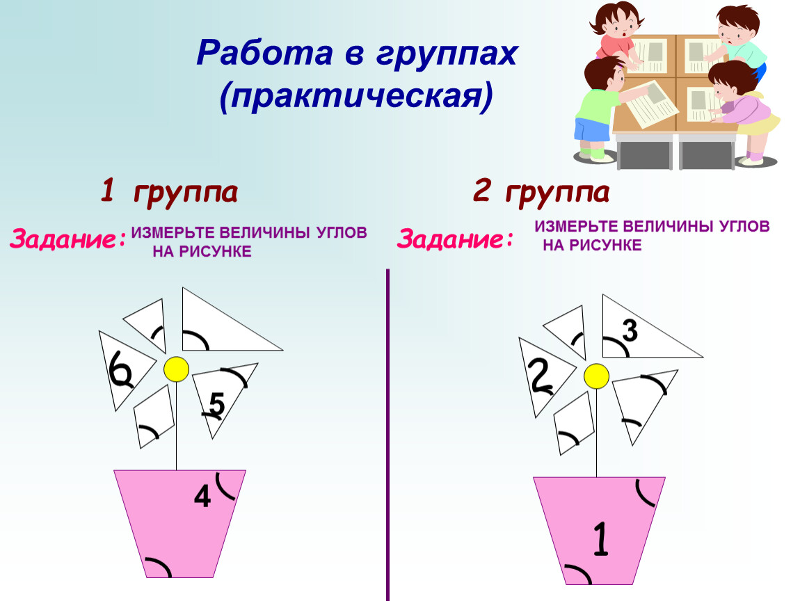 Групповые технологии. (Педагогические технологии на основе активизации и интенсификации деятельности учащихся). Проверка домашнего задания в парах. Измерение углов – работа в группах.