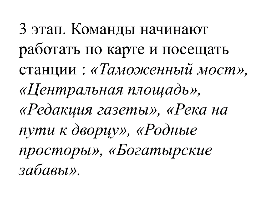 3 этап. Команды начинают работать по карте и посещать станции : «Таможенный мост», «Центральная площадь», «Редакция газеты», «Река на пути к дворцу», «Родные просторы», «Богатырские забавы».