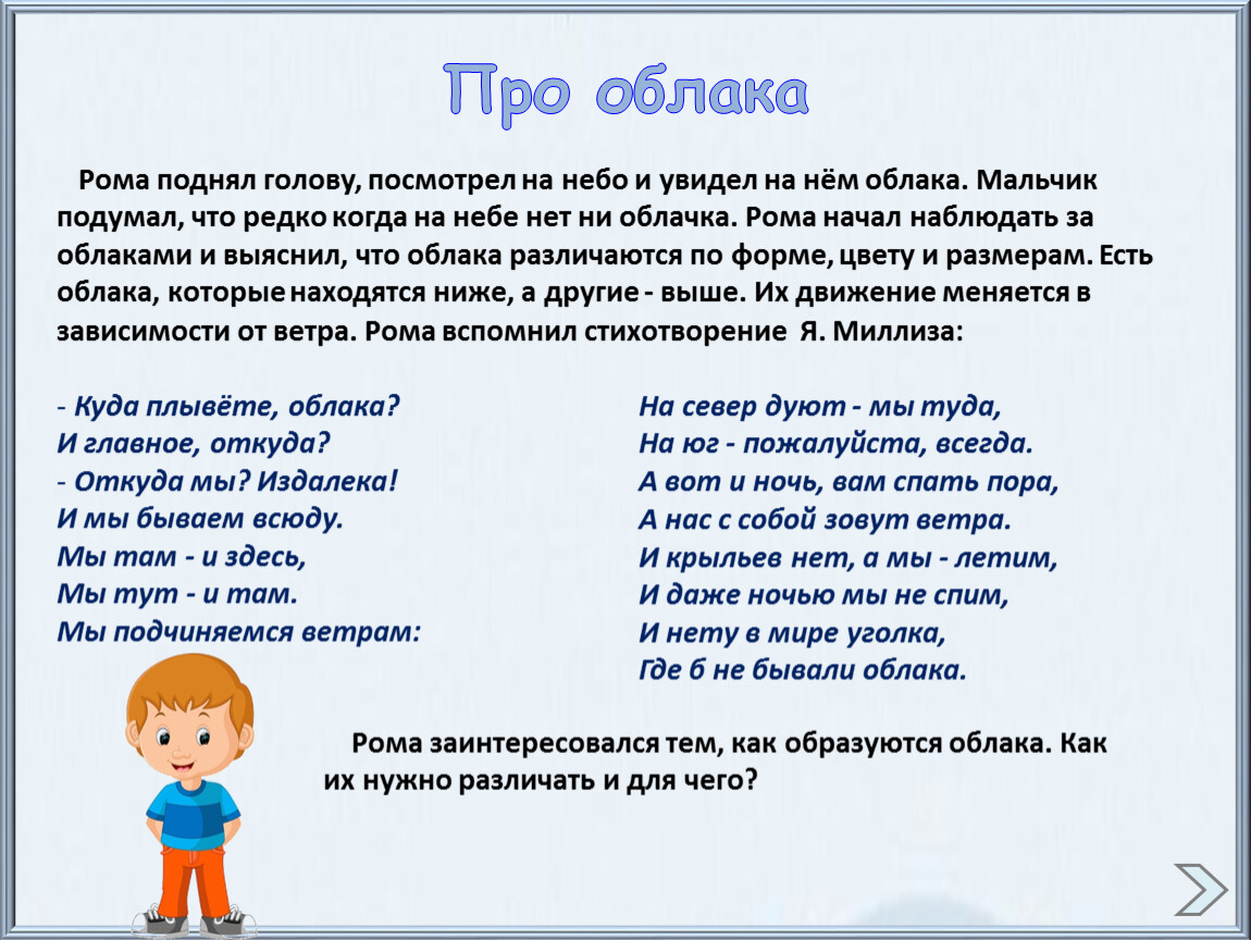 Рома поднял голову, посмотрел на небо и увидел на нём облака. Мальчик подумал, что редко когда на небе нет ни облачка. Рома начал наблюдать за облаками и выяснил, что облака различаются по форме, цвету и размерам. Есть облака, которые находятся ниже, а другие - выше. Их движение меняется в зависимости от ветра. Рома вспомнил стихотворение Я. Миллиза: