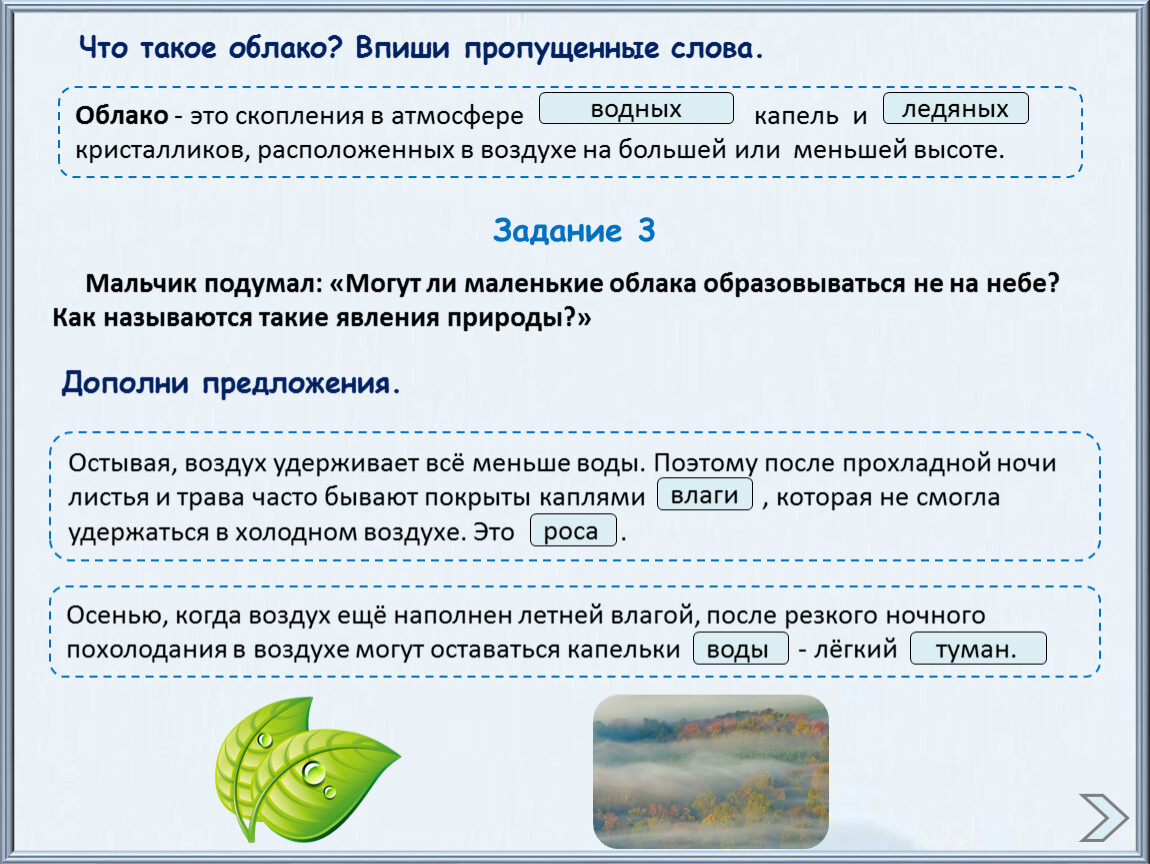 Остывая, воздух удерживает всё меньше воды. Поэтому после прохладной ночи листья и трава часто бывают покрыты каплями , которая не смогла удержаться в холодном воздухе. Это .