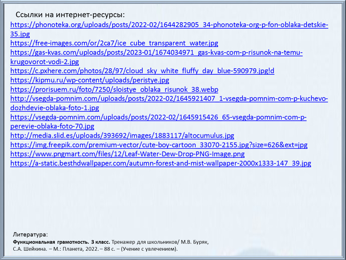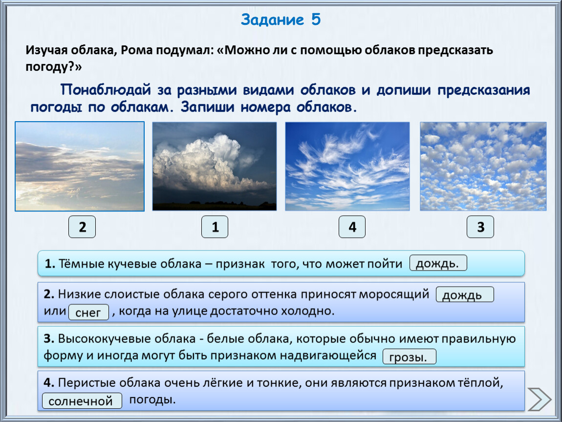 Понаблюдай за разными видами облаков и допиши предсказания погоды по облакам. Запиши номера облаков.