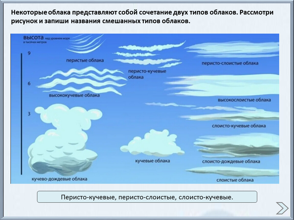 Некоторые облака представляют собой сочетание двух типов облаков. Рассмотри рисунок и запиши названия смешанных типов облаков.