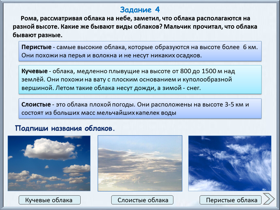 Рома, рассматривая облака на небе, заметил, что облака располагаются на разной высоте. Какие же бывают виды облаков? Мальчик прочитал, что облака бывают разные.