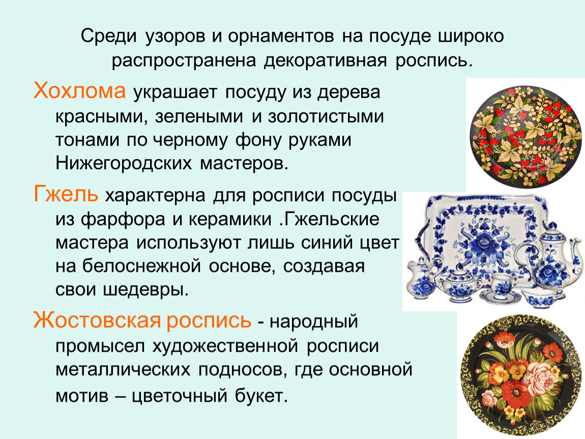 Среди узоров и орнаментов на посуде широко распространена декоративная роспись.