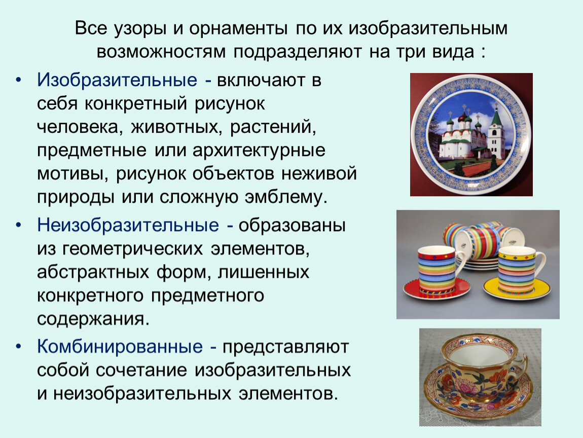 Все узоры и орнаменты по их изобразительным возможностям подразделяют на три вида :