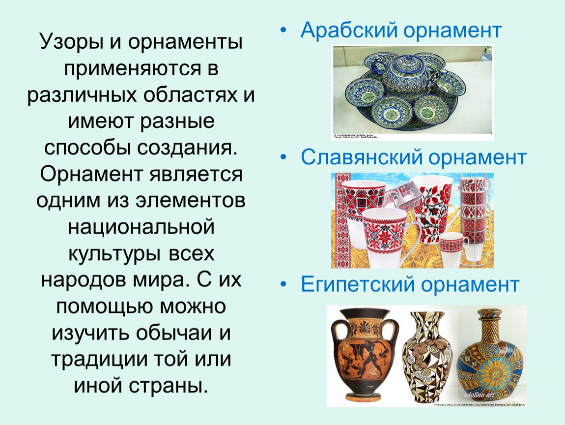 Узоры и орнаменты применяются в различных областях и имеют разные способы создания. Орнамент является одним из элементов национальной культуры всех народов мира. С их помощью можно изучить обычаи и традиции той или иной страны.