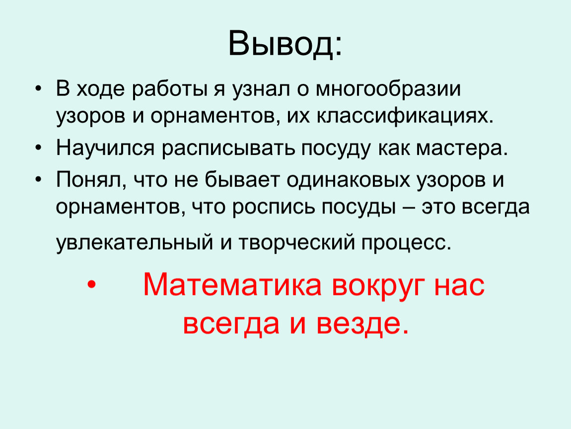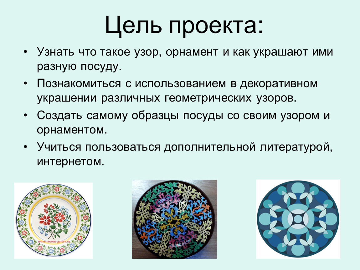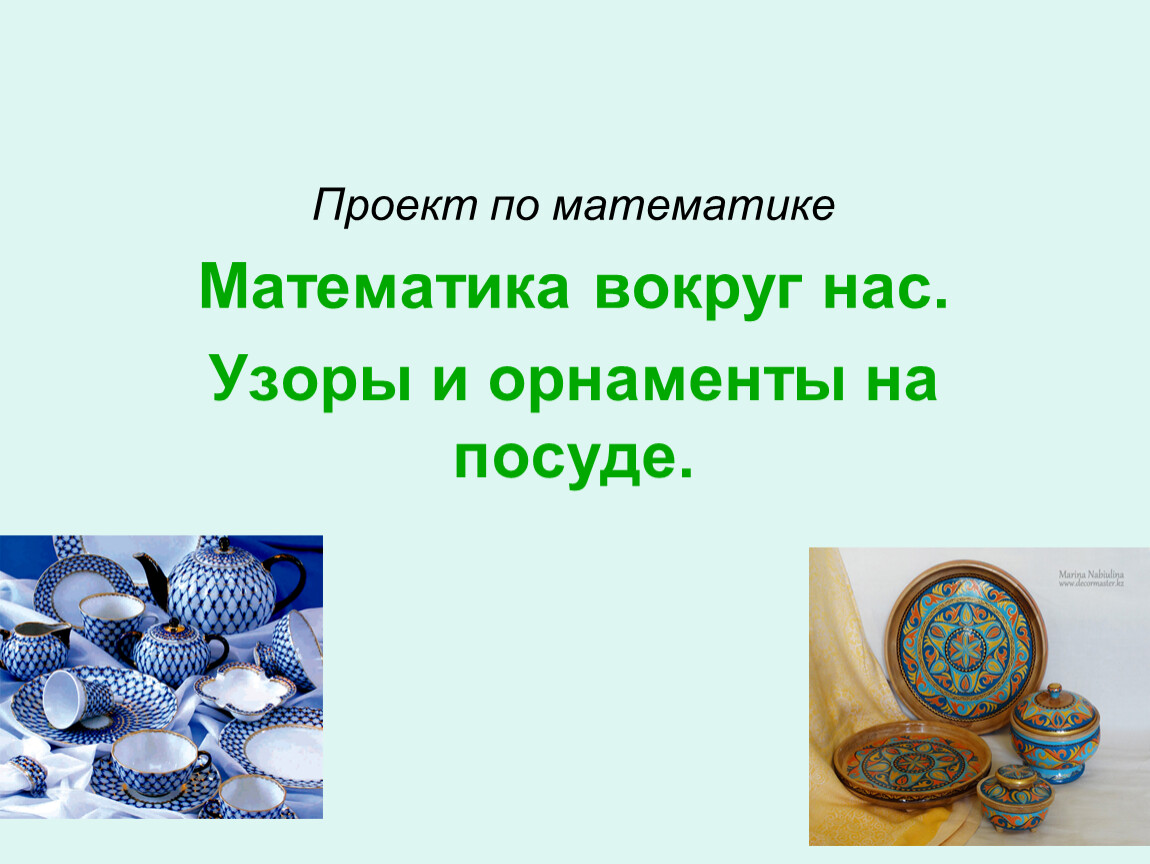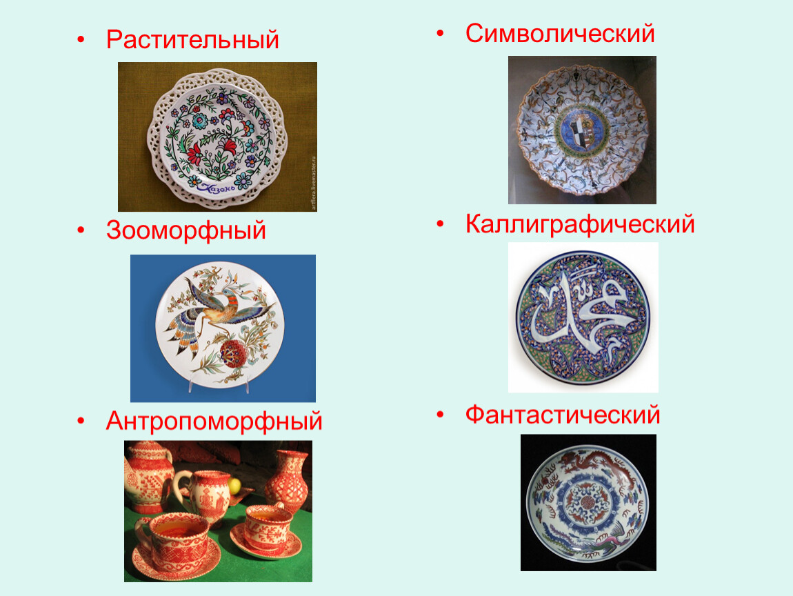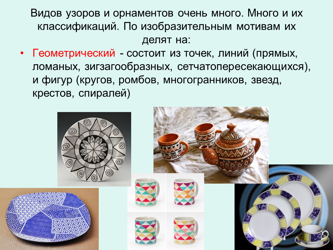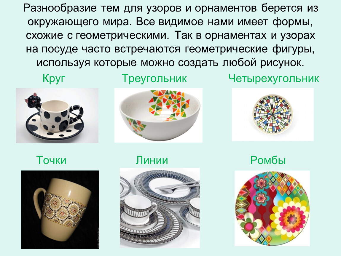 Разнообразие тем для узоров и орнаментов берется из окружающего мира. Все видимое нами имеет формы, схожие с геометрическими. Так в орнаментах и узорах на посуде часто встречаются геометрические фигуры, используя которые можно создать любой рисунок.