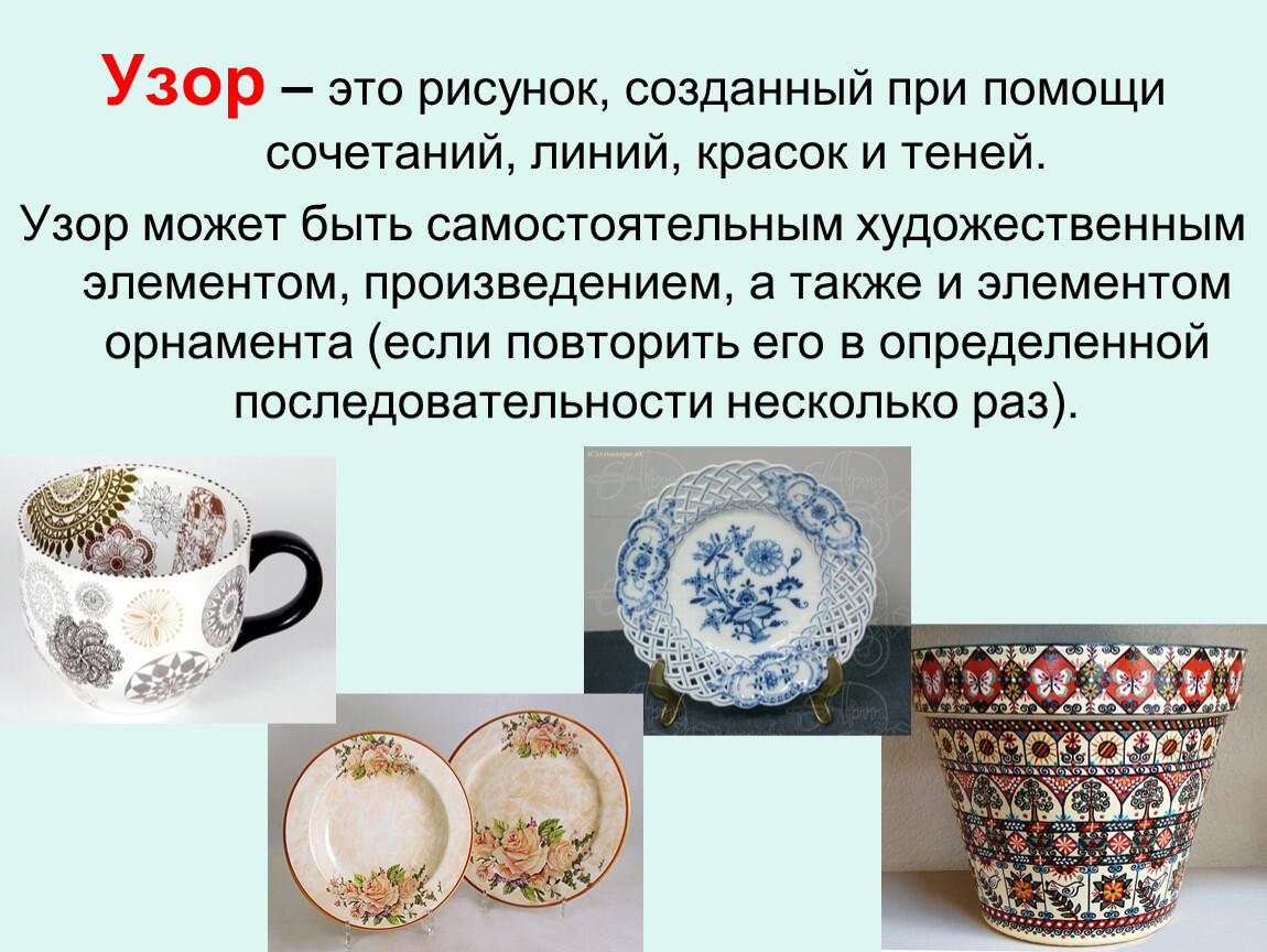 Узор – это рисунок, созданный при помощи сочетаний, линий, красок и теней.