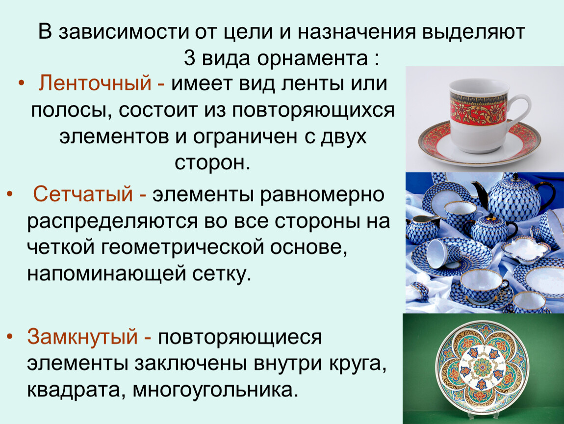 В зависимости от цели и назначения выделяют 3 вида орнамента :