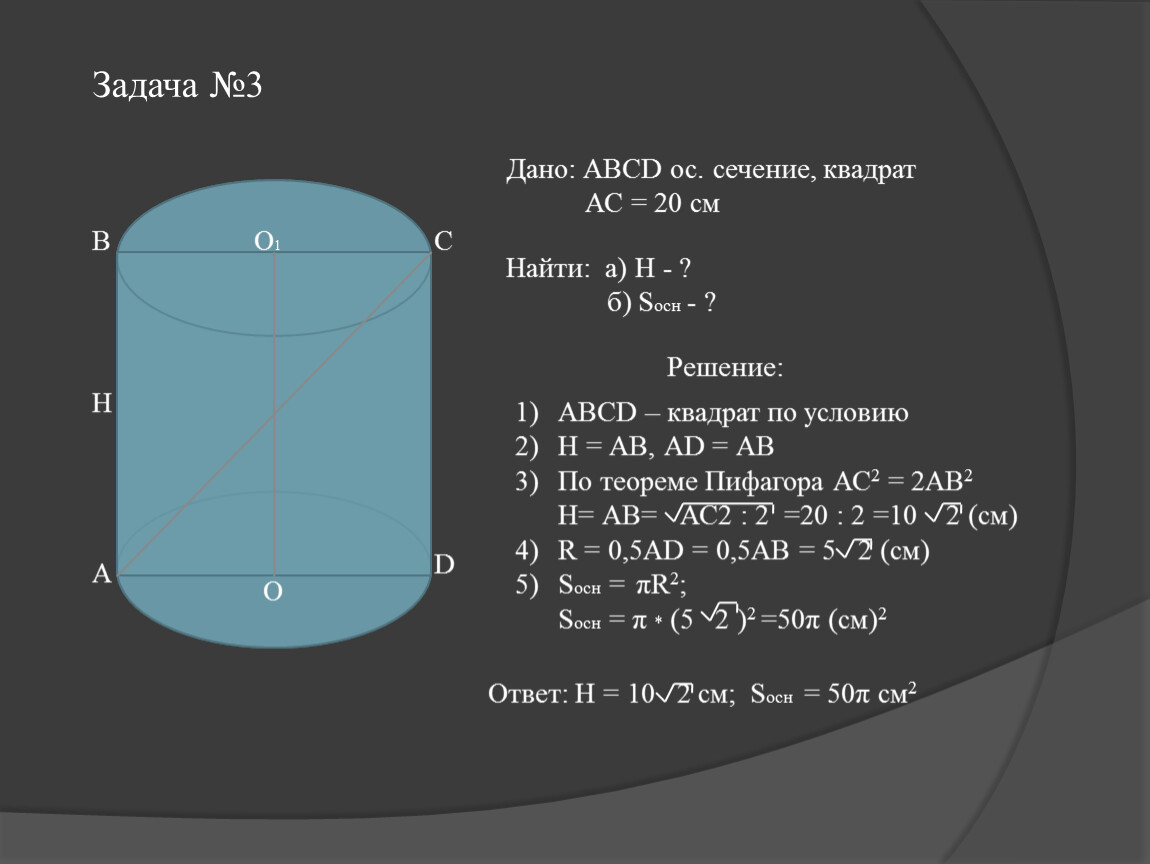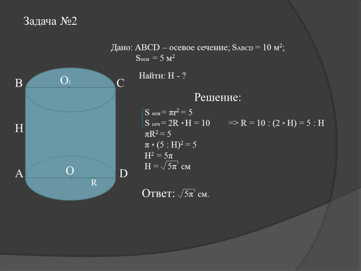 Дано: АВСD – осевое сечение; SАВСD = 10 м2;