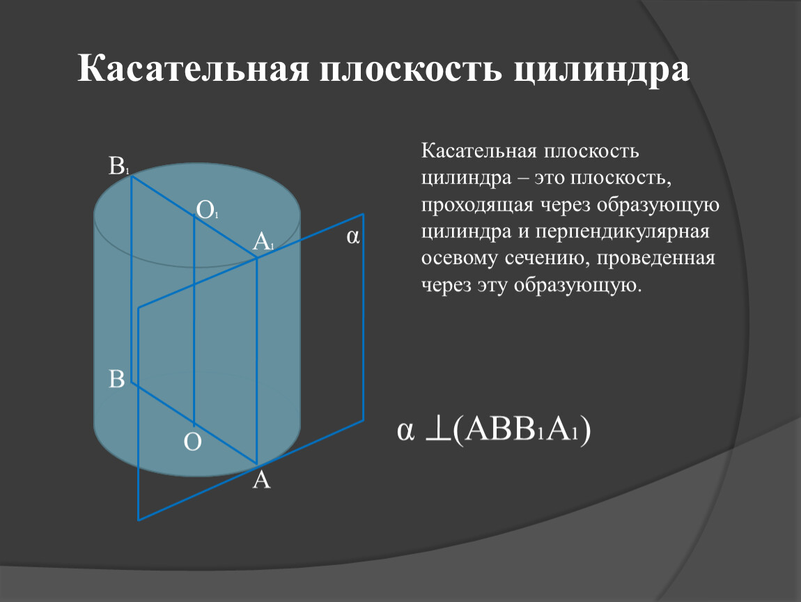 Касательная плоскость цилиндра – это плоскость, проходящая через образующую цилиндра и перпендикулярная осевому сечению, проведенная через эту образующую.