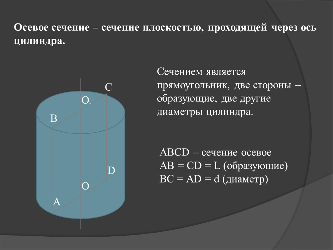 Осевое сечение – сечение плоскостью, проходящей через ось цилиндра.