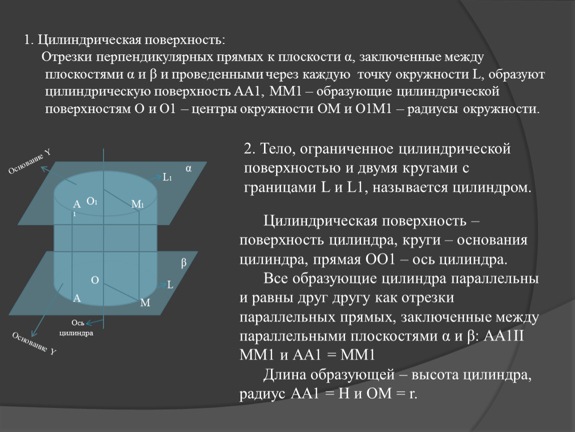 Отрезки перпендикулярных прямых к плоскости α, заключенные между плоскостями α и β и проведенными через каждую точку окружности L, образуют цилиндрическую поверхность АА1, ММ1 – образующие цилиндрической поверхностям О и О1 – центры окружности ОМ и О1М1 – радиусы окружности.