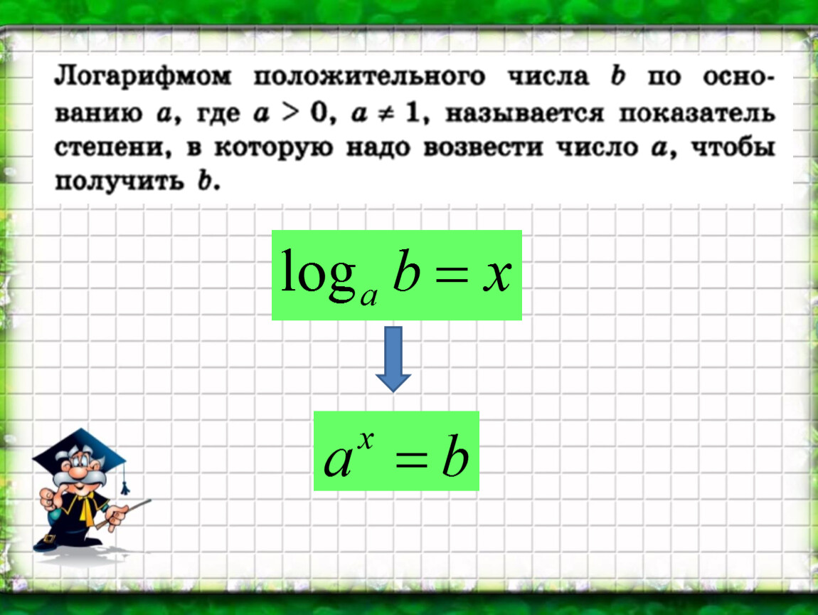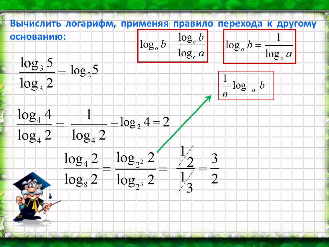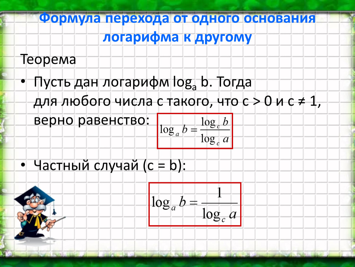 Пусть дан логарифм loga b. Тогда для любого числа c такого, что c > 0 и c ≠ 1, верно равенство: