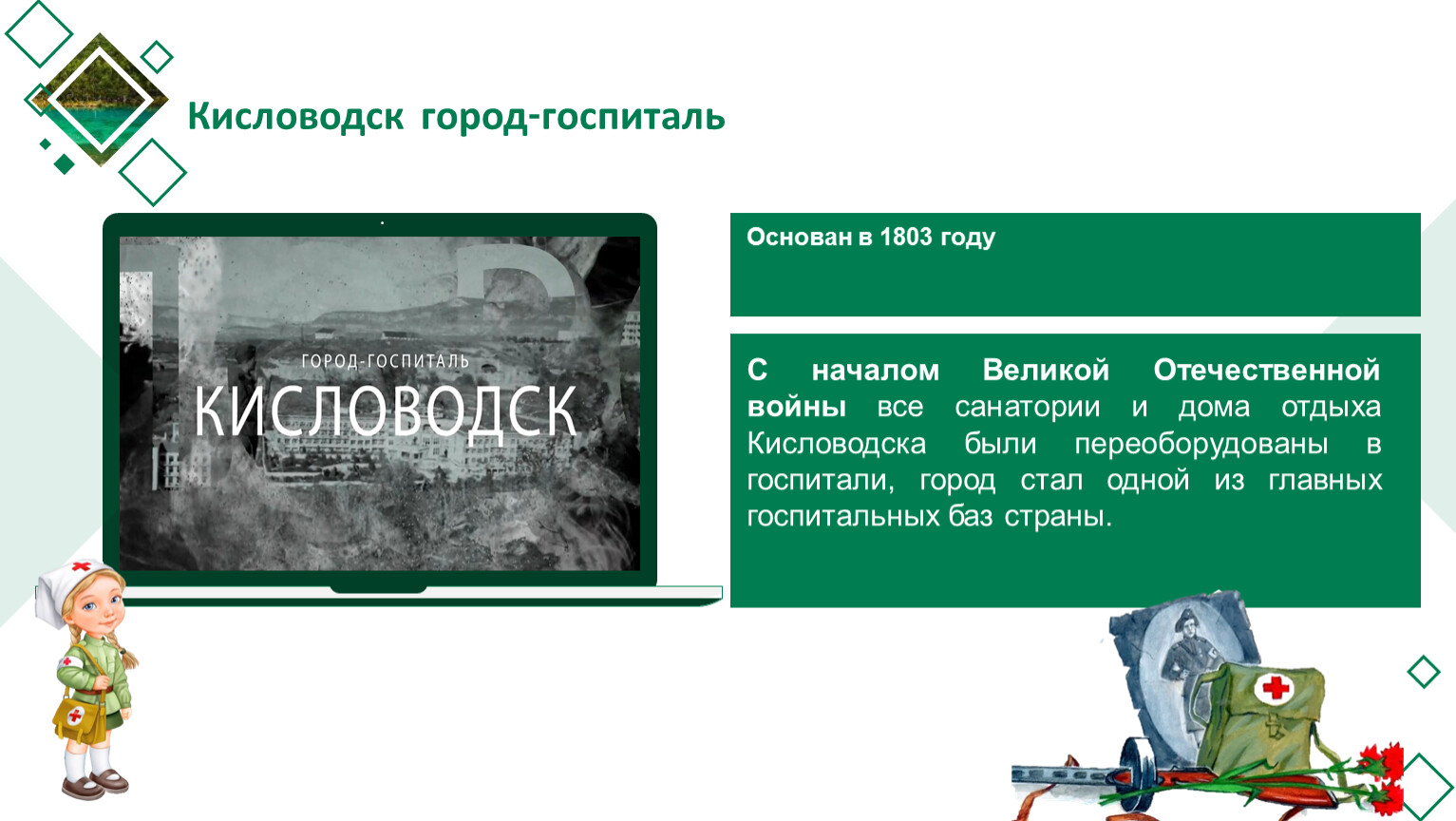 С началом Великой Отечественной войны все санатории и дома отдыха Кисловодска были переоборудованы в госпитали, город стал одной из главных госпитальных баз страны.