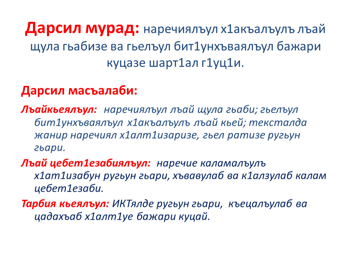 Дарсил мурад: наречиялъул х1акъалъулъ лъай щула гьабизе ва гьелъул бит1унхъваялъул бажари куцазе шарт1ал г1уц1и.