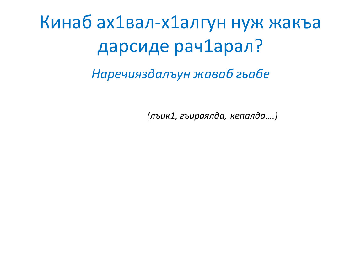 Гьаб тексталда наречиял скобкабазда жаниса хъвай.