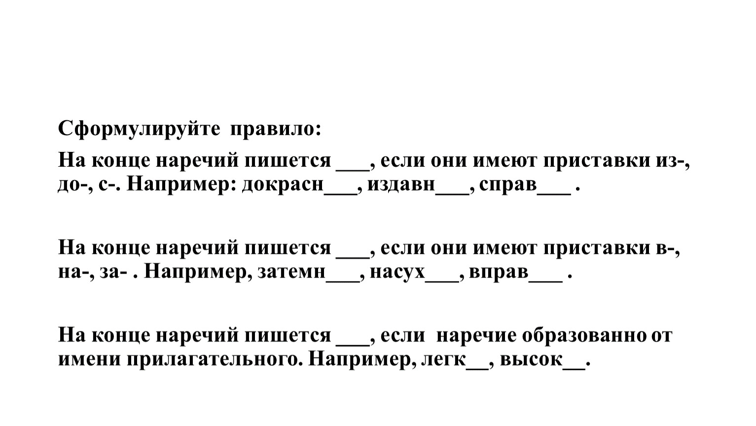 На конце наречий пишется ___, если они имеют приставки из-, до-, с-. Например: докрасн___, издавн___, справ___ .