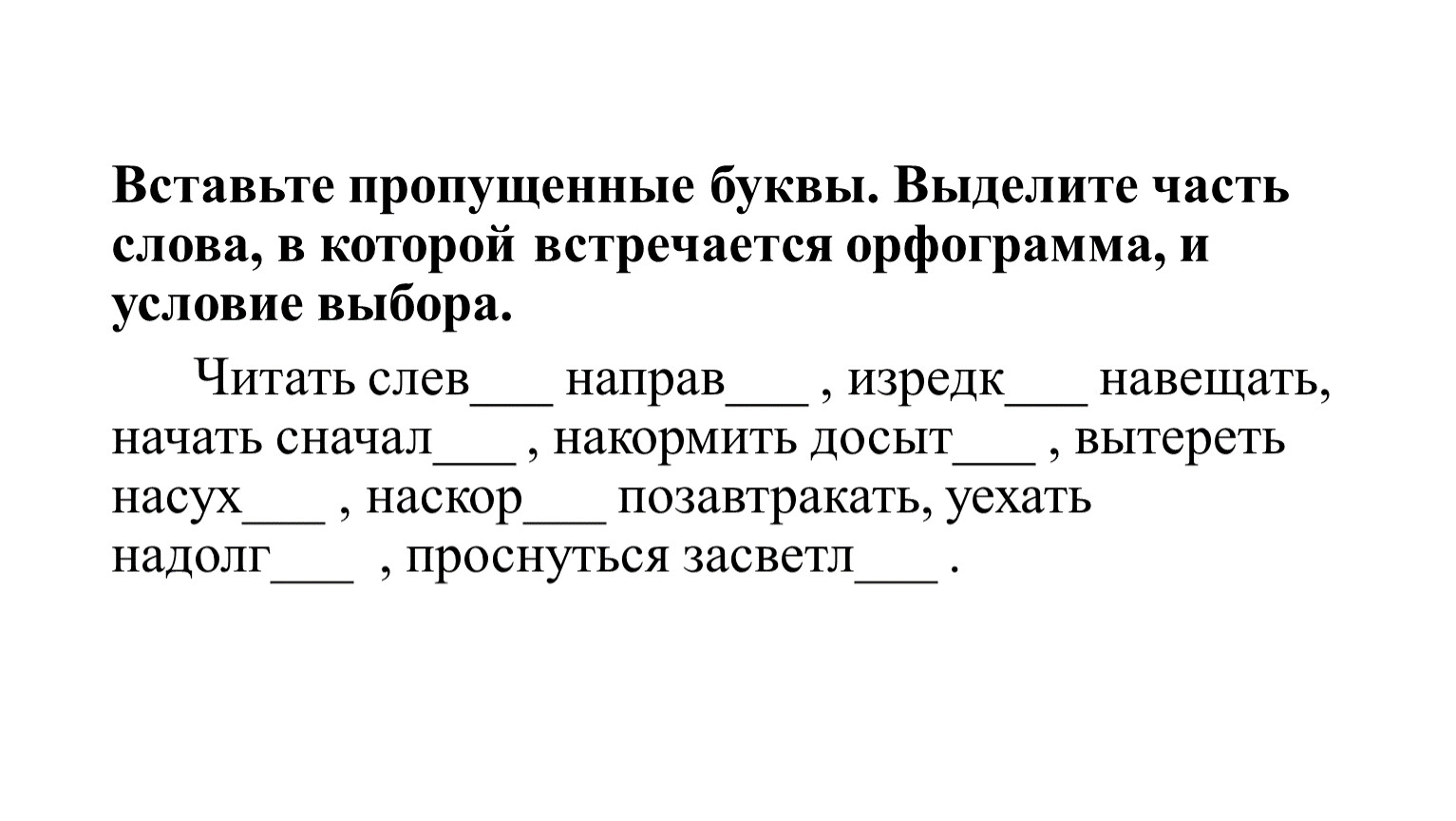 Вставьте пропущенные буквы. Выделите часть слова, в которой встречается орфограмма, и условие выбора.