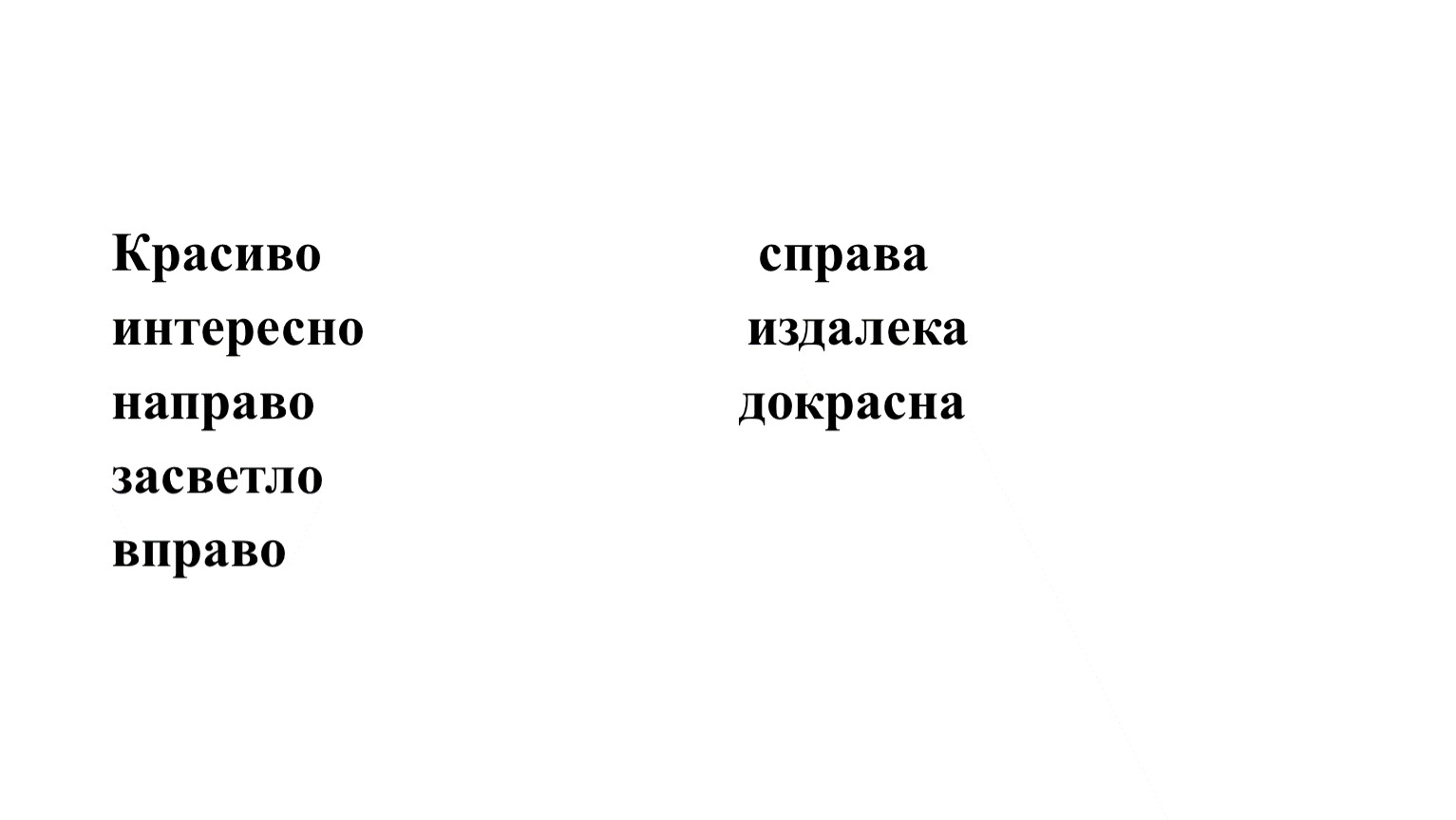 ( хорошо, интересно, скучно, страшно, дружно, сначала, сегодня, правильно, изредка, навсегда, отлично, бесполезно)