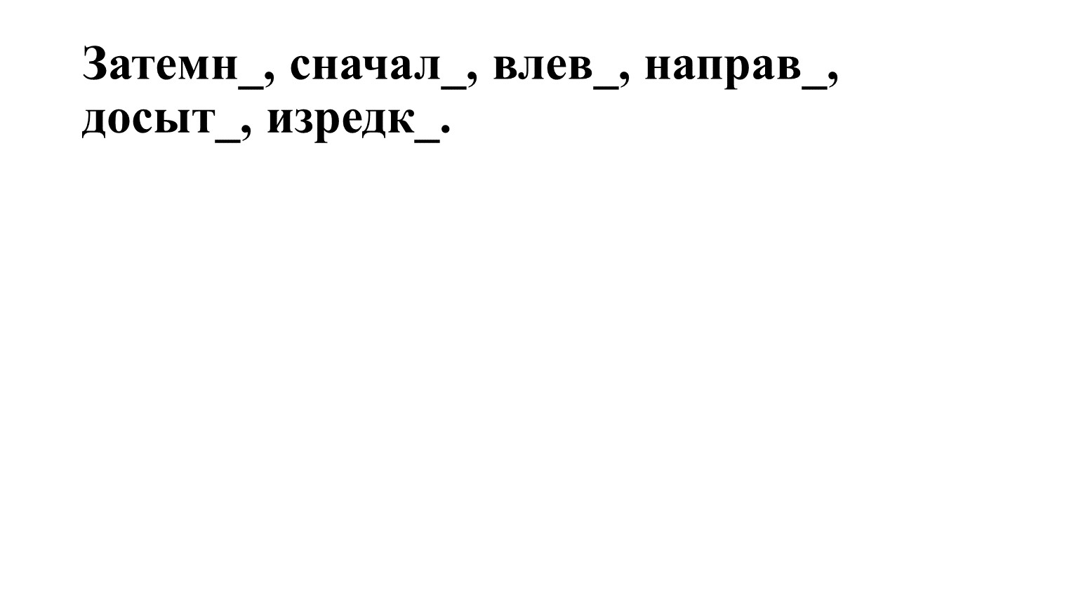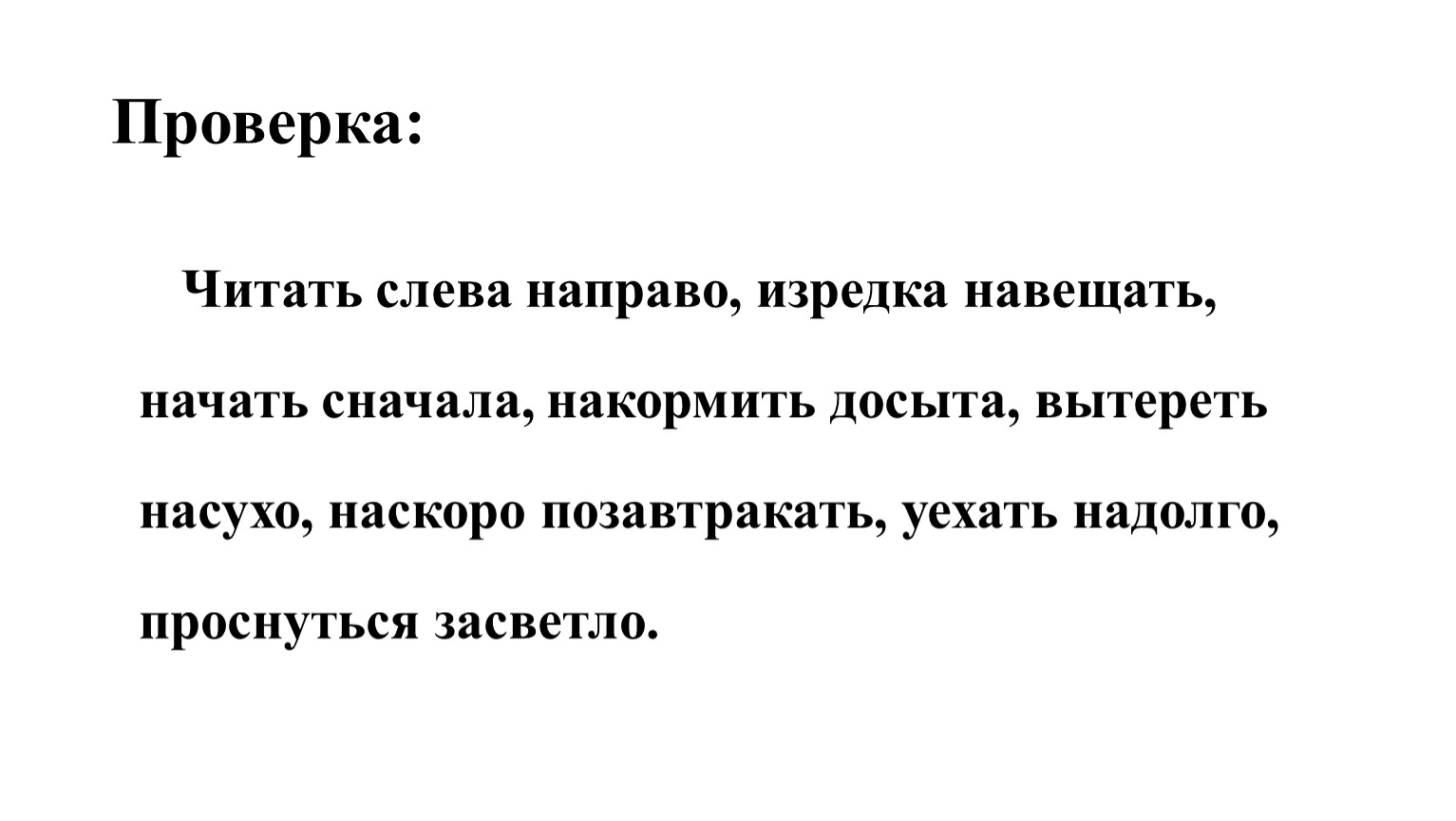 Читать слева направо, изредка навещать, начать сначала, накормить досыта, вытереть насухо, наскоро позавтракать, уехать надолго, проснуться засветло.