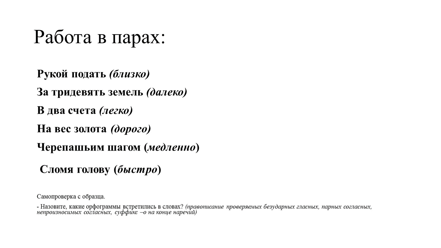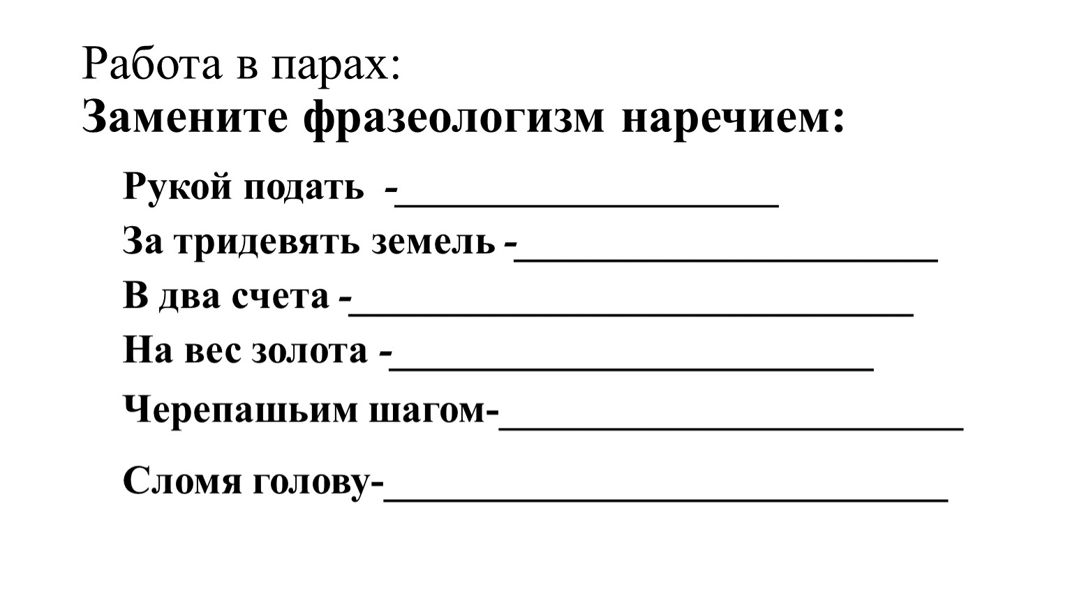 Работа в парах:Замените фразеологизм наречием: